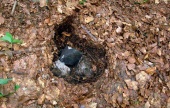 Maga główna in situ (2,293 kg[13]) we fragmentach; (So far the only documented impact cavity (BOJO fragments of the Jesenice meteorite) of any meteorite hitting the ground in the territory of Slovenia. In it, part of broken stone substratum can clearly be seen. Diameter around 22 cm. Photo: Miha Jeršek) |