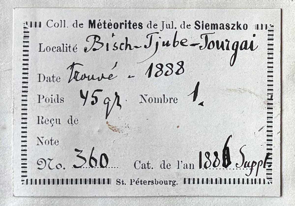 Meteorite Bischtübe. Label Julian Siemaszko (collection: James R. Gregory; © Jarkko Kettunen).
