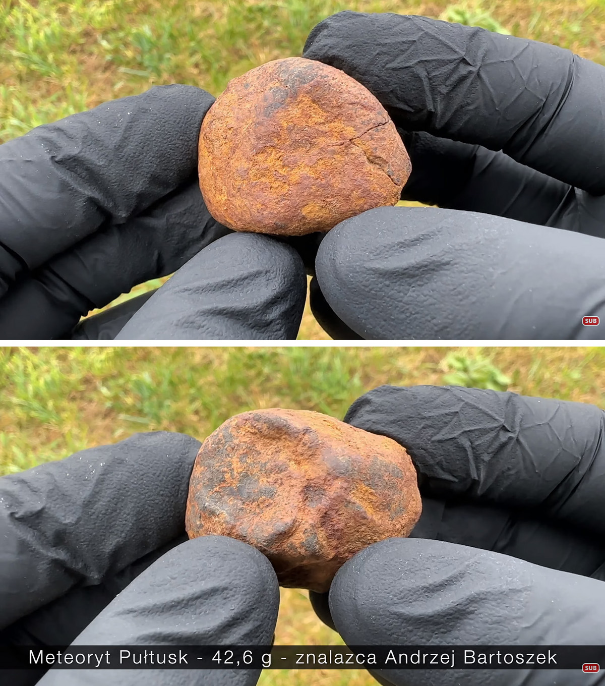 Meteoryt Pułtusk; znalazca Andrzej Bartoszek (fot. Szymon Kozłowski; źródło: YouTube).
